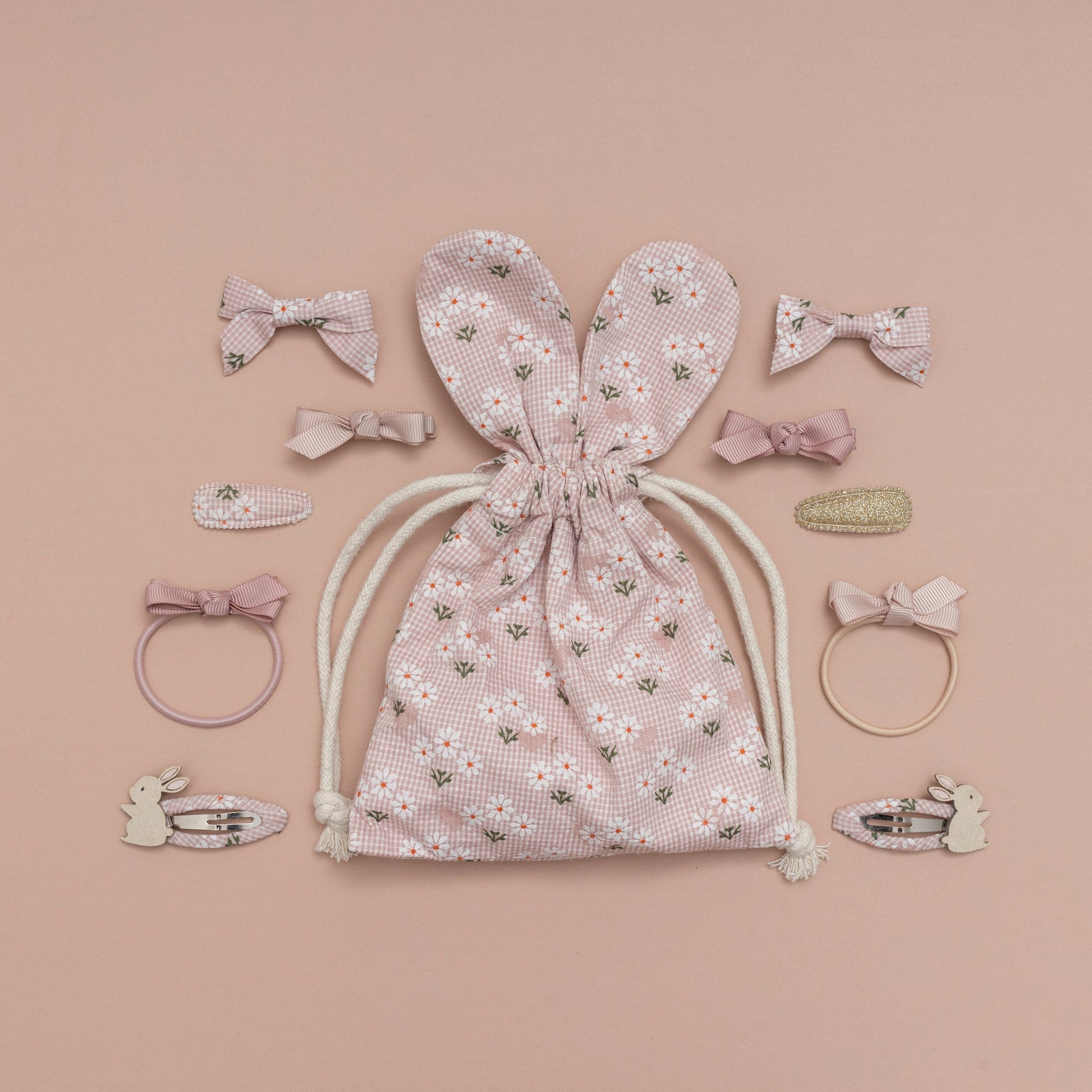 Looking for a sweet alternative Easter gift without the added sugar? This adorable bunny shaped floral pouch packed with ten beautiful hair accessories makes for the perfect springtime surprise!