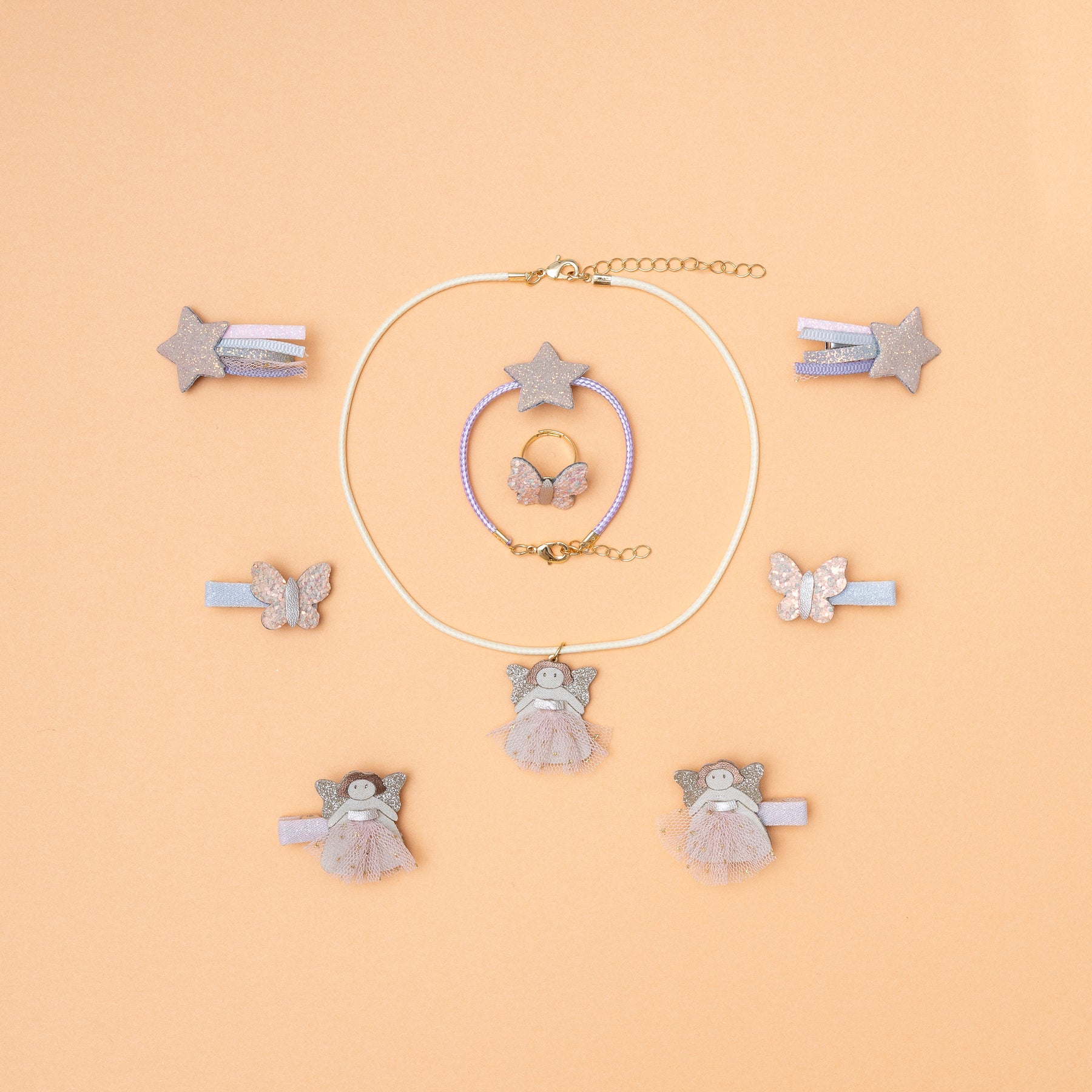 - Set includes one necklace, bracelet and a ring featuring a sweet fairy with tulle skirt, a sparkling butterfly and twinkling star all crafted from soft suedette, glitter and metallic fabrics
